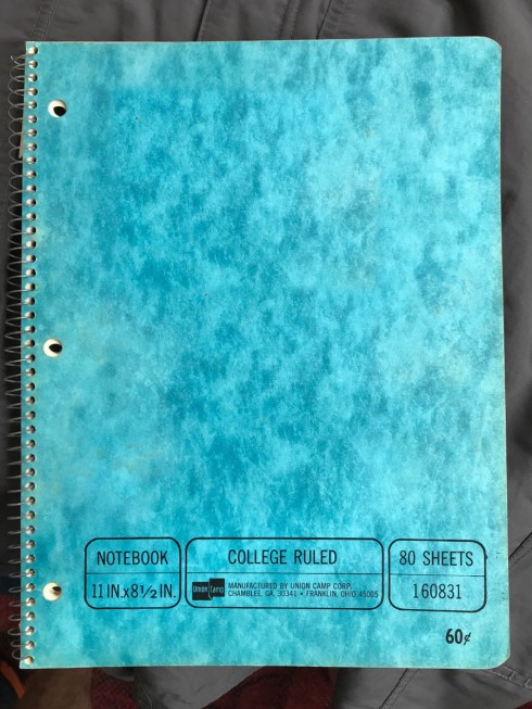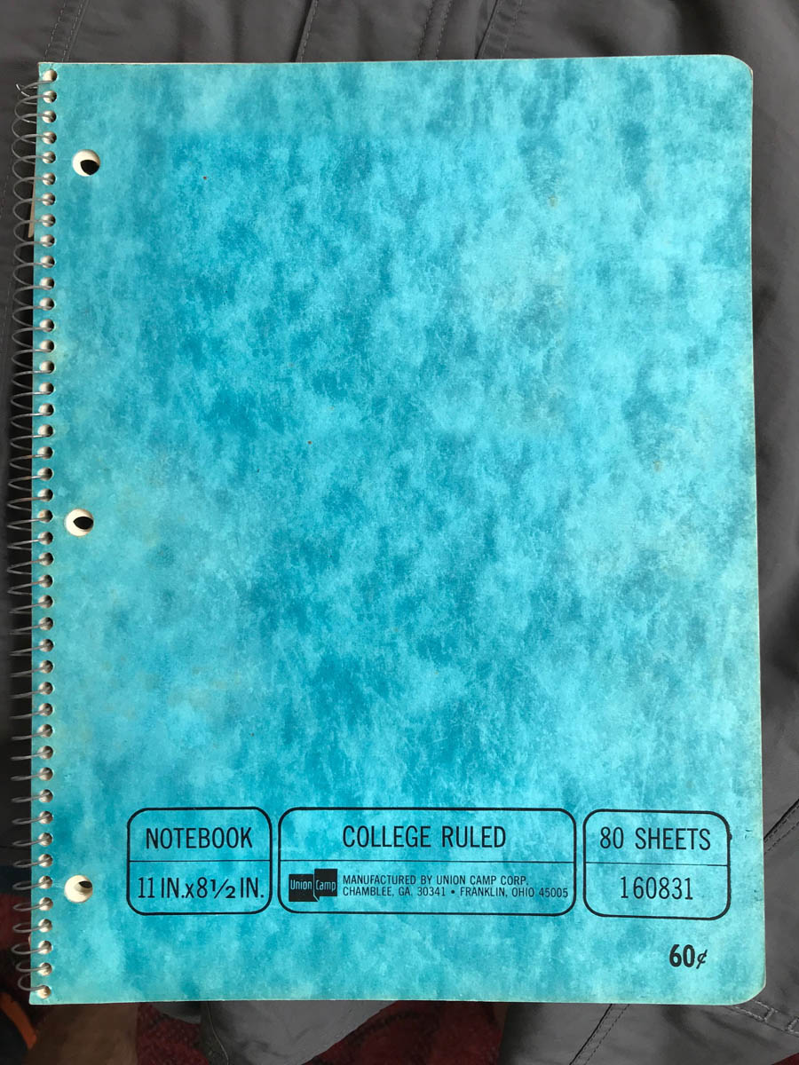 ‘This notebook emerged from somewhere the other day, I asked Stephen about it, and he said I’d thrown it out a long time ago and he’d retrieved it. Always a dangerous action for a mate, IMO. Turns out it was for History 112 at UGA, Spring Quarter 1971, which I guess was my first quarter back in school after the Air Force. In the process of revisiting my stellarly pathetic note taking style prior to re-throwing it out, I found this microscopic drawing in the margin of a page. WTF…’