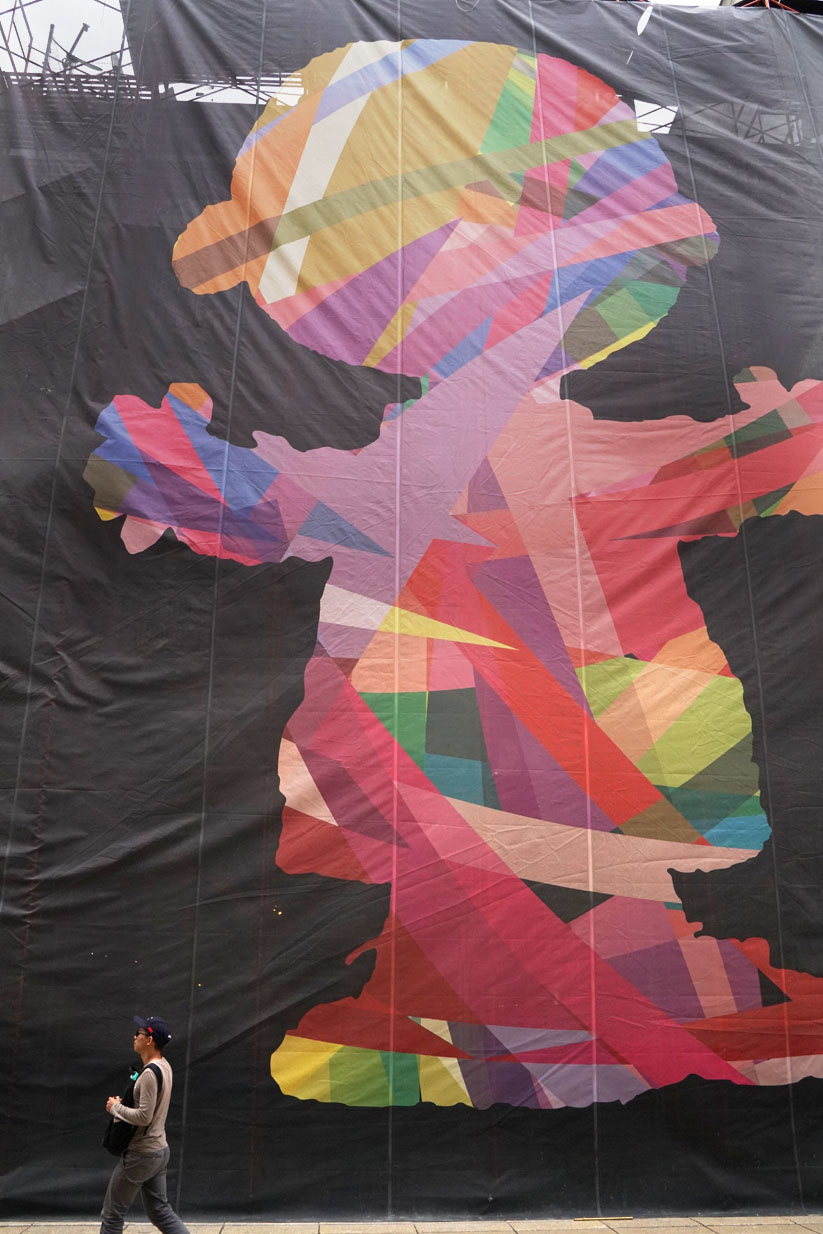 Our phone GPS kept telling us that we had ‘arrived’, but to our frustration, it was nowhere to be found. Then, finally, I walked to the opposite side of the street, turned around, and behold: an enormous graphic on a tarpaulin covering the scaffolding on the front of the building, with a small passthrough to the interior.