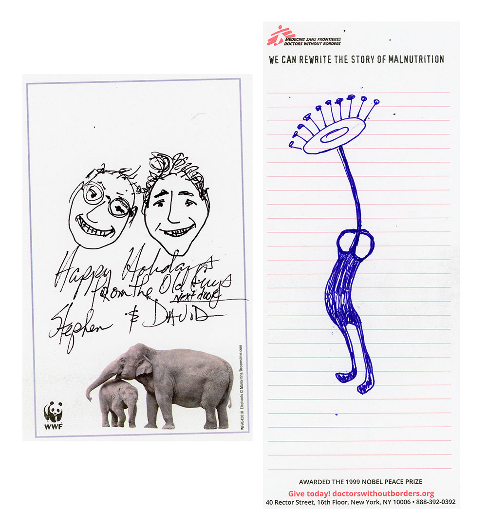 Here is a note I copied before it left the house attached to cookies bound for a neighbor, and a quick doodle for something he was working on about ‘tooting your own horn’. Click to enlarge.