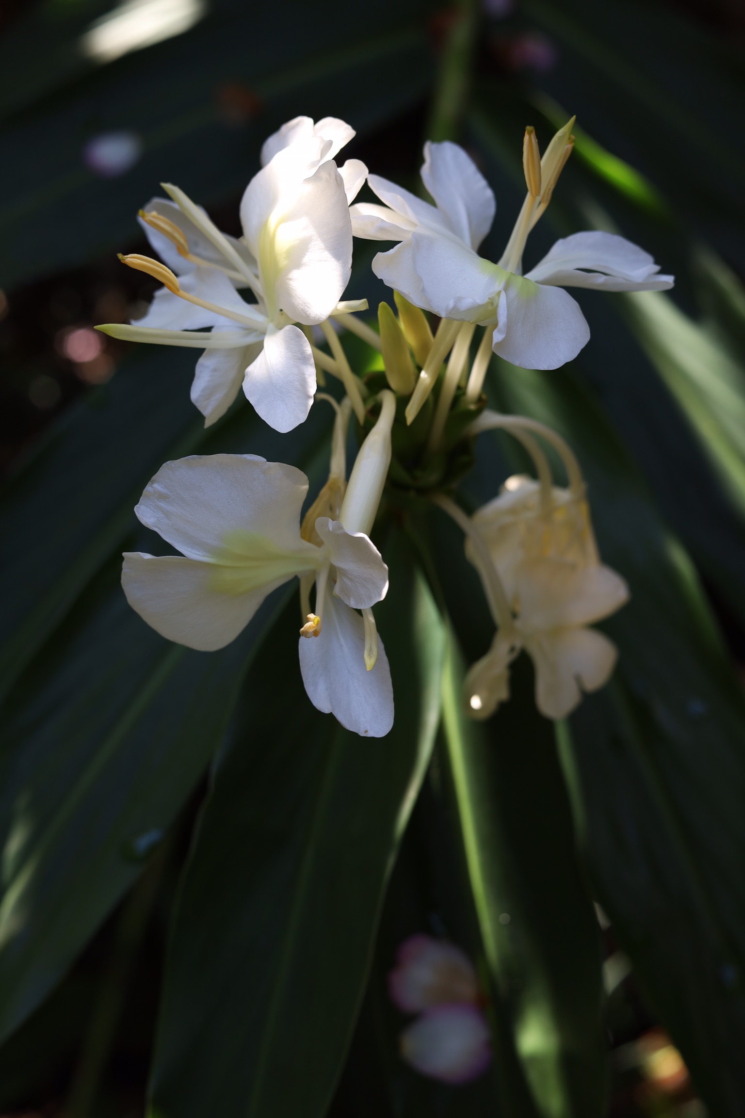 Now the ’light’, the last of the ginger lilies, a small cluster of blossoms saved from the cold in a sequestered spot in our postage stamp-sized front yard/courtyard. (One of the men delivering our new washing machine last July asked me if we planted ’all this stuff, or did it just grow up’. Sometimes I wonder.)